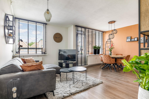 Vanuit hier loopt u door naar de woonkamer, een lichte en prettige ruimte dankzij het brede raam en het vrije uitzicht op het groen. De zithoek en eethoek vormen een logische, sfeervolle indeling, waarbij de keuken mooi aansluit.